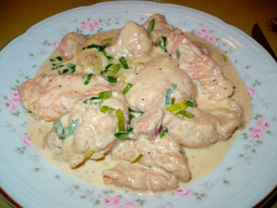 Lavar las mollejas en varias aguas, colocarlas en una cacerola con agua hirviendo y una cuchara de vinagre, dejarlas unos minutos, retirarlas y quitarles la membrana. Se cocinan las mollejas enteras al horno, luego se filetean y se doran con abundante manteca, agregando la cebolla y los champiñones, condimentar con sal y pimienta, agregar el vino, dejar consumir un poco la salsa. Retirar las mollejas, colocarlas en una fuente para su presentación. Agregar al fondo de cocción la crema, calentar unos minutos. Colocar esta salsa sobre las mollejas.